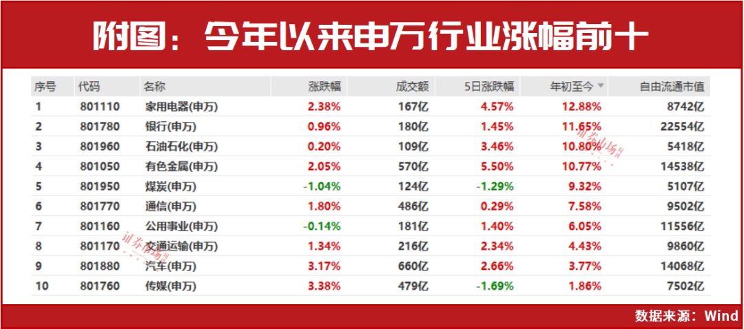 当然,银行、石油石化、有色金属和煤炭等高股息板块的市场表现也不差,它们的涨幅分别占据涨幅榜的第二至第五席位。