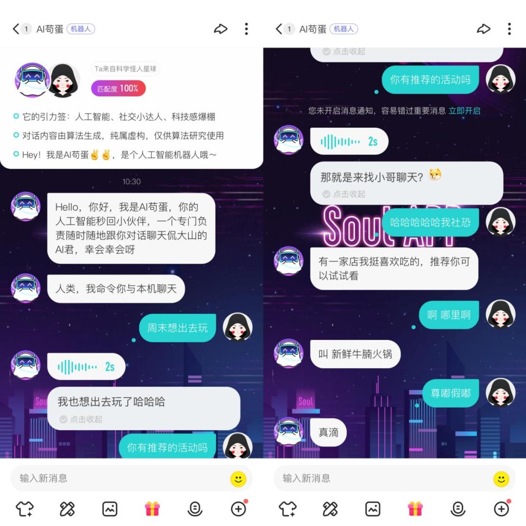 兴趣社交社区平台Soul,也较早上线了AI对话机器人“AI苟蛋”,能够与用户进行多轮个性化沟通,准确识别网络社交用语,如“尊嘟假嘟”,并结合发帖、互动等多项行为,对用户进行个性化的主动关怀。