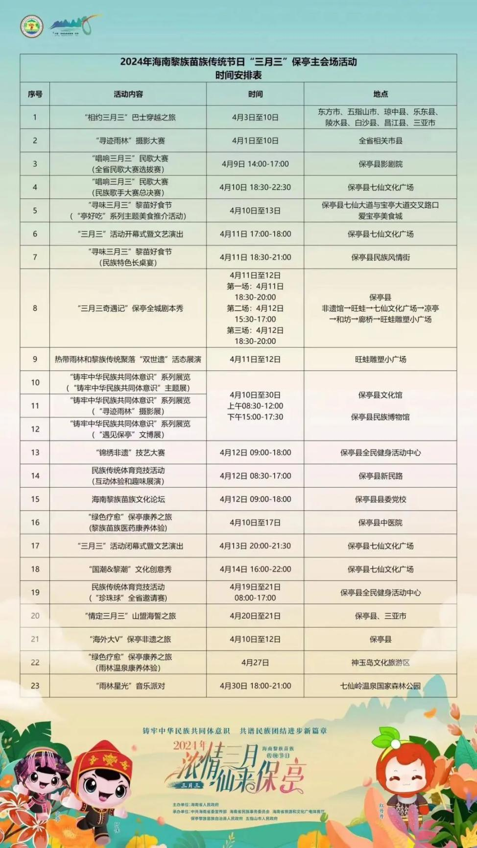 2024年海南“三月三”主会场——保亭 ,邀您来参与民族风盛宴啦!保亭旅文局将根据“三月三”具体活动推出3条出游线路,pick你中意的线路、背起行囊,赴一场“三月三”之约!