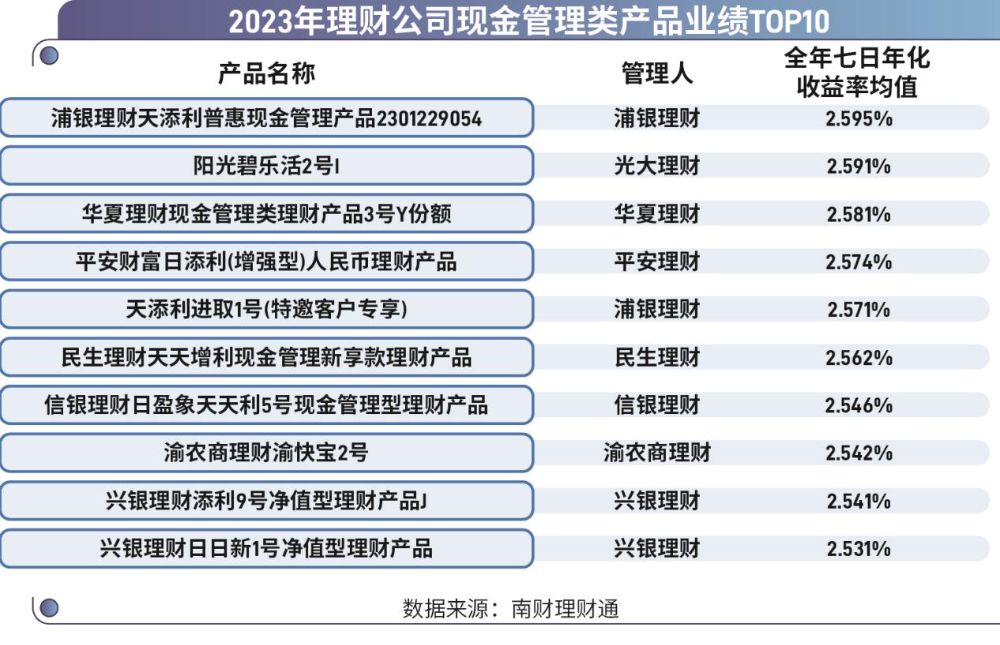 据南财理财通数据,2023年全年现金管理产品收益榜单中,浦银理财、兴银理财、光大理财、华夏理财、民生理财、平安理财、信银理财和渝农商理财共8家理财公司产品跻身前十,其中浦银理财和兴银理财各有2只产品上榜,其他理财公司各上榜1只产品。值得关注的是,上榜机构类型均为股份行理财公司和城农商行理财公司,无国有行理财公司产品上榜。