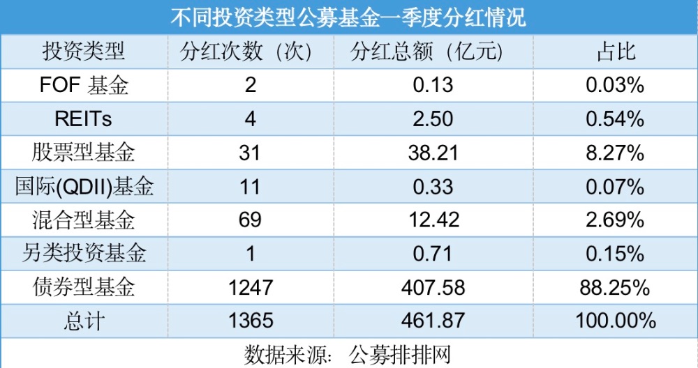 总体来看,一季度债基是公募分红的主力,分红总额超400亿元,占公募基金分红总额的近九成。