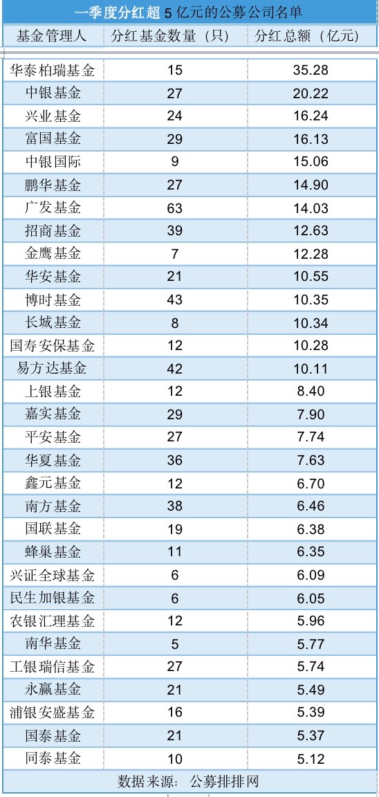 一季度华泰柏瑞基金以分红总额35.28亿元一骑绝尘,比第二名中银基金的20.22亿元还多15.06亿元,超出幅度为75%。