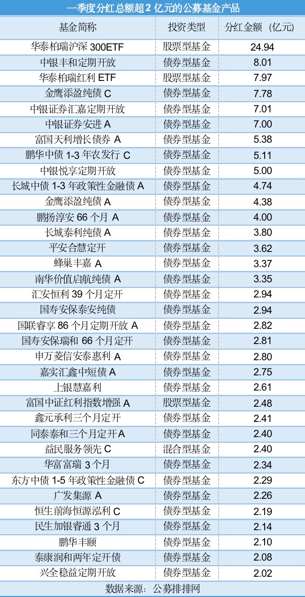 一季度分红总额超2亿元的35只公募基金产品中,债券基金31只,占比88.57%。