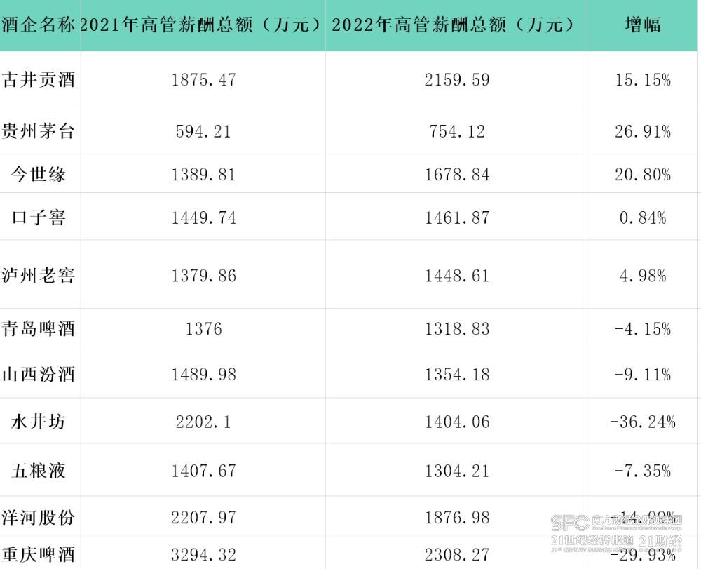 贵州茅台2022年高管薪酬总额仅为754.12万元,在11家酒企中最少,但相比2021年高管薪酬总额,2022年增幅达26.91%,位列第一。