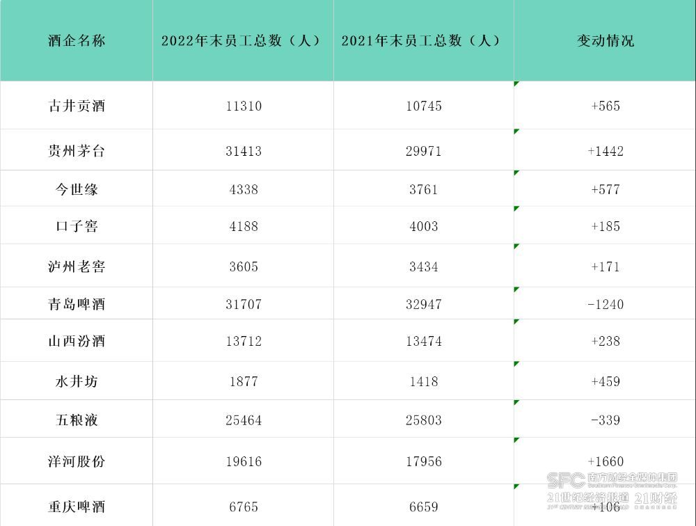其中,洋河股份2022年末员工总数为19616人,相比2021年末员工总数增加1660人,位列第一。贵州茅台以31413人在2022年末员工总数中排行第一,相比2021年末员工总数增加1442人。