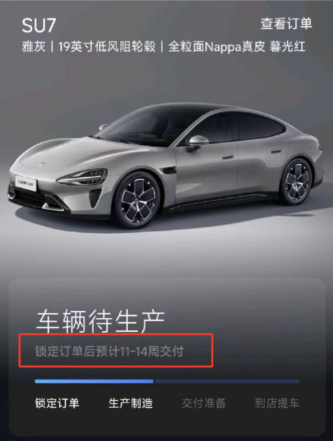 在产能方面,有预定了小米SU7的用户表示,自己的车辆交付时间从4月底变成了锁定订单后的11-14周。另据媒体报道,截至4月3日,小米汽车App显示,小米汽车SU7交付时间已经延长,部分订单锁单后排到半年左右,其中标准版预计13-16周交付,时间最长的Max版本则需24-27周。不少网友自嘲称,自己买的不是小米SU7而是小米的新能源期货。