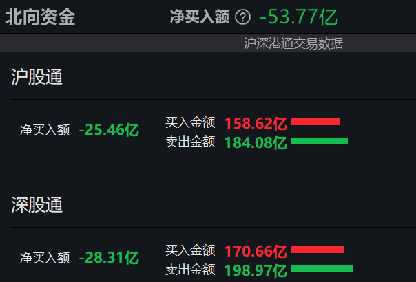 北向资金半日净卖出53.77亿元。其中沪股通净卖出25.46亿元,深股通净卖出28.31亿元。