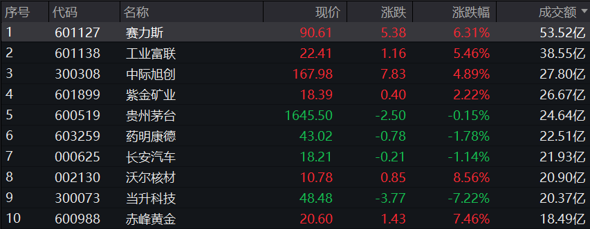 沪深两市半日成交额4713亿,较上个交易日同期缩量252亿。个股方面,赛力斯半日成交额53.52亿元居首,工业富联成交额超30亿元,中际旭创、紫金矿业、贵州茅台、药明康德、长安汽车、沃尔核材、当升科技成交额超20亿元。