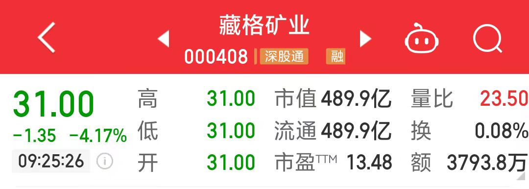 4月16日,藏格矿业(000408.SZ)开盘大跌4.17%,报31元,总市值489.9亿元。消息面上,公司实控人肖永明因涉嫌刑事案件被自贡市公安局执行指定居所监视居住。