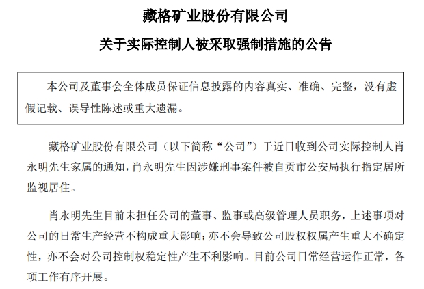 藏格矿业表示,肖永明目前未担任公司的董事、监事或高级管理人员职务,上述事项对公司的日常生产经营不构成重大影响;亦不会导致公司股权权属产生重大不确定性,亦不会对公司控制权稳定性产生不利影响。目前公司日常经营运作正常,各项工作有序开展。