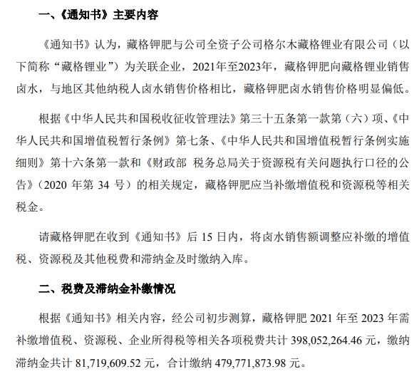 《通知书》内容显示,藏格钾肥与藏格矿业全资子公司藏格锂业为关联企业,2021年至2023年,藏格钾肥向藏格锂业销售卤水,与地区其他纳税人卤水销售价格相比,藏格钾肥卤水销售价格明显偏低。根据相关法规的规定,藏格钾肥应当补缴增值税和资源税等相关税金。