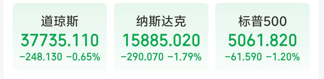 周一美股全线下挫。截至收盘,道指跌248.13点,跌幅0.65%,报37735.11点;纳指跌1.79%,报15885.02点;标普500指数跌1.20%,报5061.82点。衡量市场波动性的恐慌指数VIX大涨超11%,报19.23。