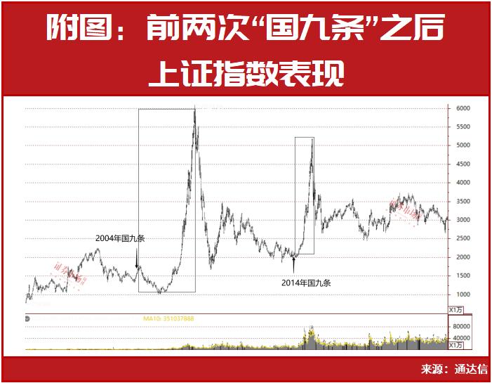 值得一提的是,这也是我国资本市场时隔10年迎来的第三个“国九条”。 前两个“国九条”分别出现于2004年、2014年,且之前两次“国九条”出台后,市场均在后期迎来了超级牛市行情,如上证指数于2007年上涨至6124点、于2015年上涨至5178点(见附图)。