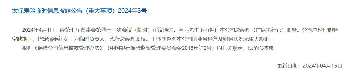 4月15日,太保寿险在官网发布临时信息披露公告称,2024年4月1日,经第七届董事会第四十三次会议(临时)审议通过,蔡强先生不再担任本公司总经理(首席执行官)职务。公司总经理职务空缺期间,指定潘艳红女士为临时负责人,代行总经理职权。上述调整对本公司的业务经营及财务状况无重大影响。