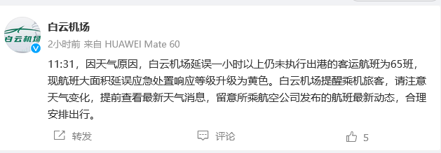 19日上午11:31,因天气原因,白云机场延误一小时以上仍未执行出港的客运航班为65班,现航班大面积延误应急处置响应等级升级为黄色。