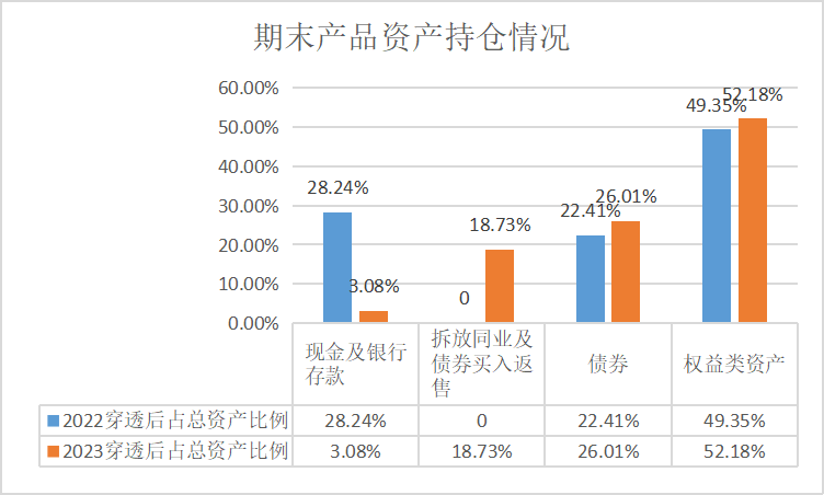 本次榜首汇华理财“汇泽灵活配置开放式混合类”理财产品内部风险评级为PR4(中高风险),经南财理财通课题组梳理,产品2023年四季度穿透后持仓比去年同期增加了“拆放同业及债券买入返售”(占比18.73%),“债券及权益类资产”比例也有所提高,“现金及银行存款”占比则由28.24%骤降到3.08%,资产持仓情况较上年有所调整。