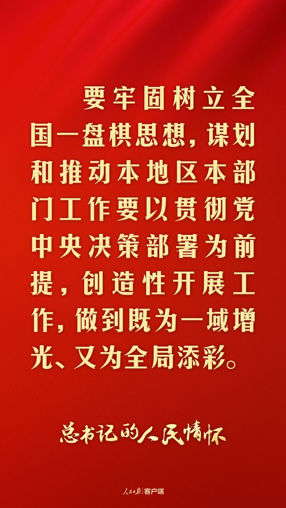 “要牢固树立全国一盘棋思想,谋划和推动本地区本部门工作要以贯彻党中央决策部署为前提,创造性开展工作,做到既为一域增光、又为全局添彩。”
