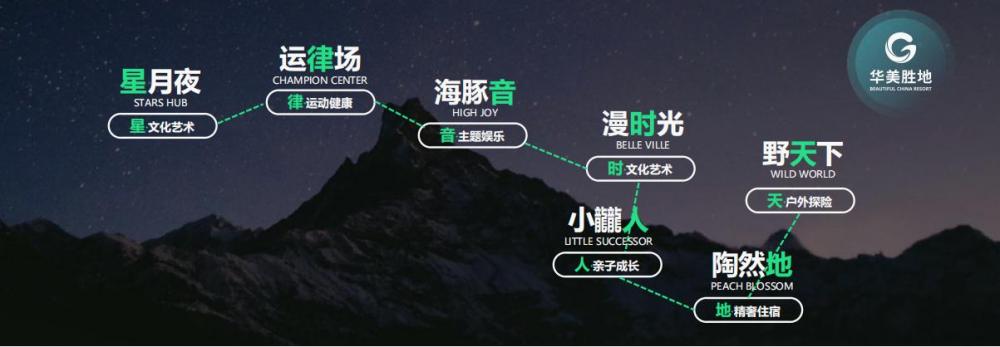 “大美中华 乐在其中”,华美胜地打造一流“国潮品牌”,传承中华先进文化基因,深入诠释自然探索之美、诗意栖居之美、饕餮饮食之美、运动活力之美、成长陪伴之美、自在休闲之美、文化艺术之美的品牌美学,集合形成户外探险、主题娱乐、亲子成长、运动健康、商业休闲、精奢住宿、文化艺术多元业态,提供一站式高品质美好度假生活场景。