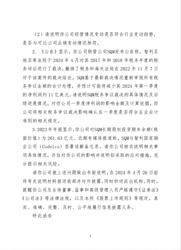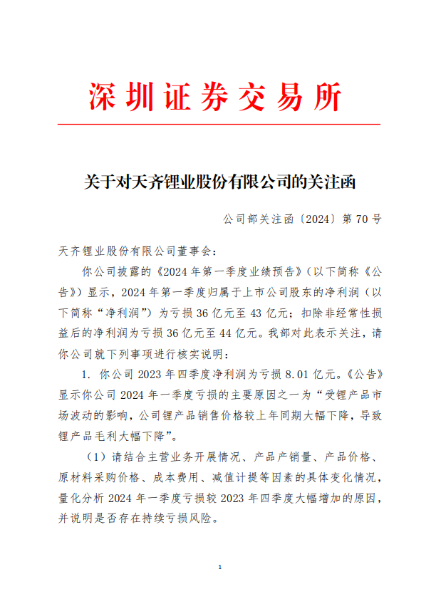 4月23日晚,深交所向天齐锂业下发关注函,要求公司结合主营业务开展情况、产品产销量、产品价格、原材料采购价格、成本费用、减值计提等因素的具体变化情况,量化分析2024年一季度亏损较2023年四季度大幅增加的原因,并说明是否存在持续亏损风险等。