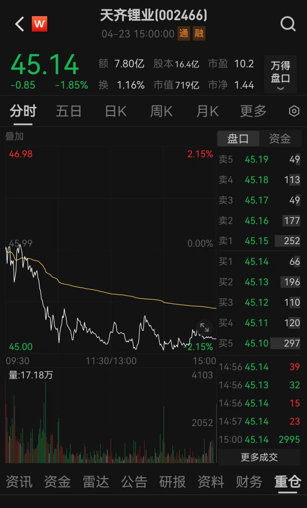 今日,天齐锂业收跌1.85%,报45.14元/股,总市值719亿元。