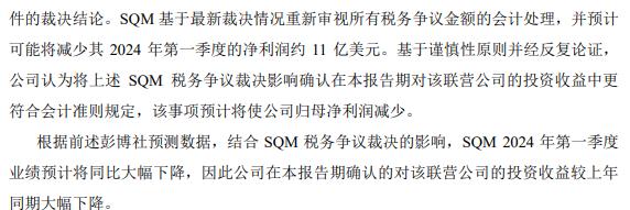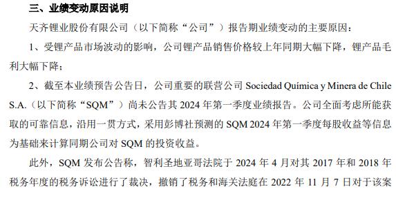 对于业绩变动的原因,天齐锂业表示,受锂产品市场波动的影响,公司锂产品销售价格较上年同期大幅下降,锂产品毛利大幅下降;公司重要的联营公司SQM第一季度业绩预计将同比大幅下降,因此公司在本报告期确认的对该联营公司的投资收益较上年同期大幅下降。