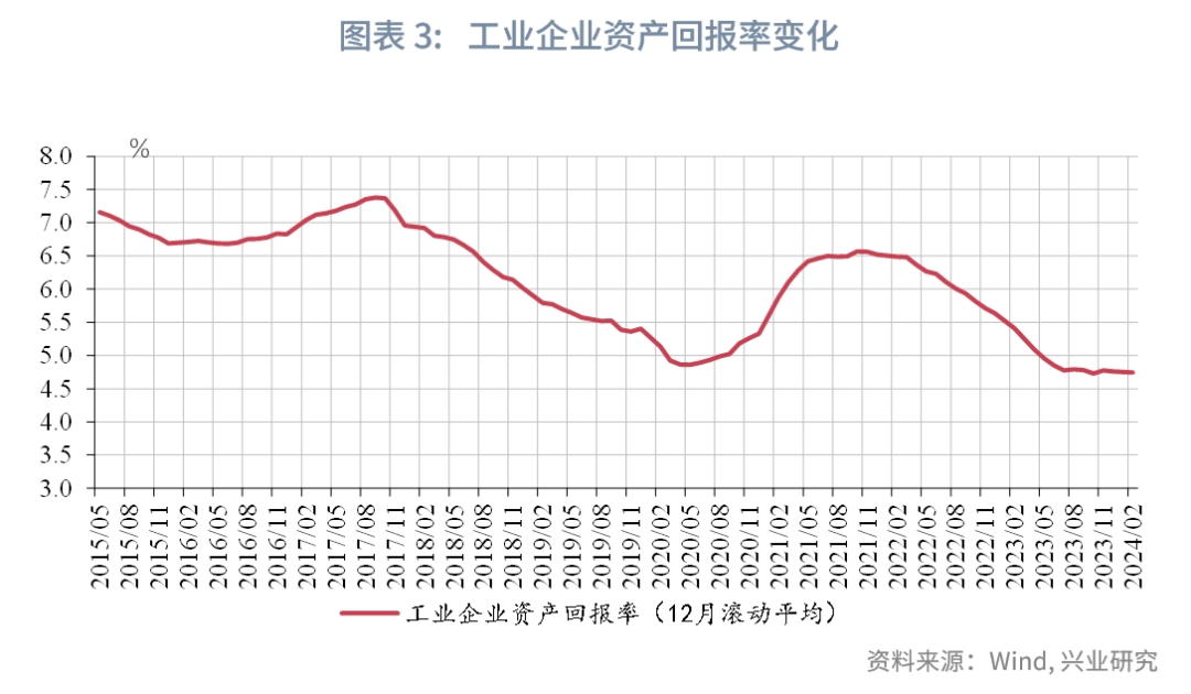 二是从工业企业的盈利和回报率情况来看,工业企业ROA仍处于低位。2022年以来,工业企业ROA总体呈现波动下降的趋势。2024年1-2月,在低基数之下,工业企业利润总额累计同比达到10.2%,但工业企业的资产回报率仍处于低位,使用滚动12月利润计算的ROA为4.75%,较景气高点的2021年下降约1.8个百分点。从企业贷款利率来看,根据央行披露,2024年3月,新发放企业贷款利率为3.75%,和上年末持平,反映出如无额外政策支持,企业贷款利率下降的动力不足。
