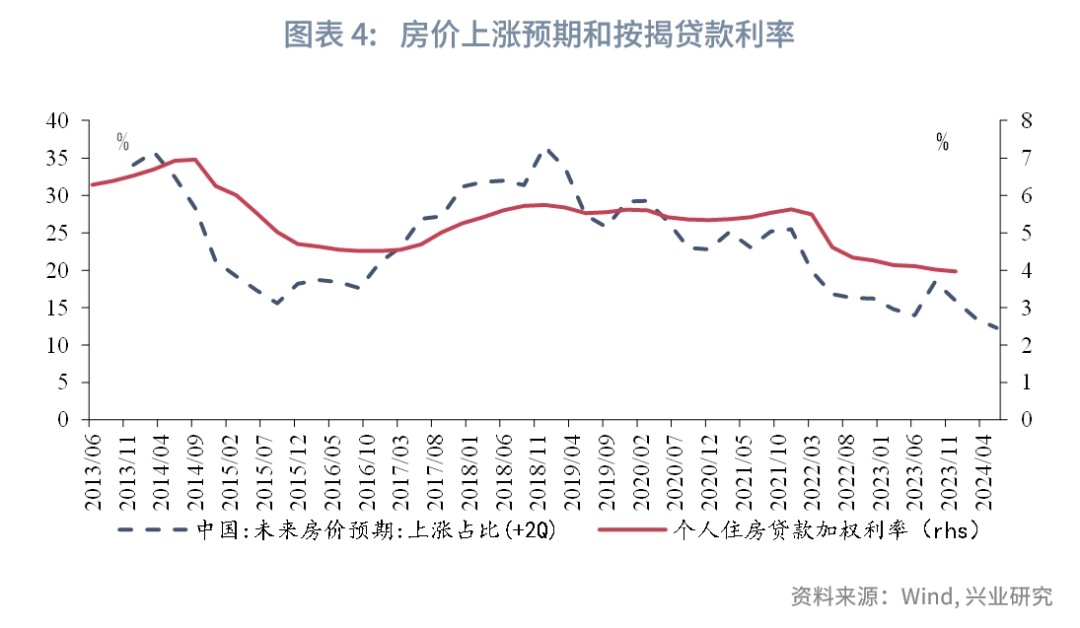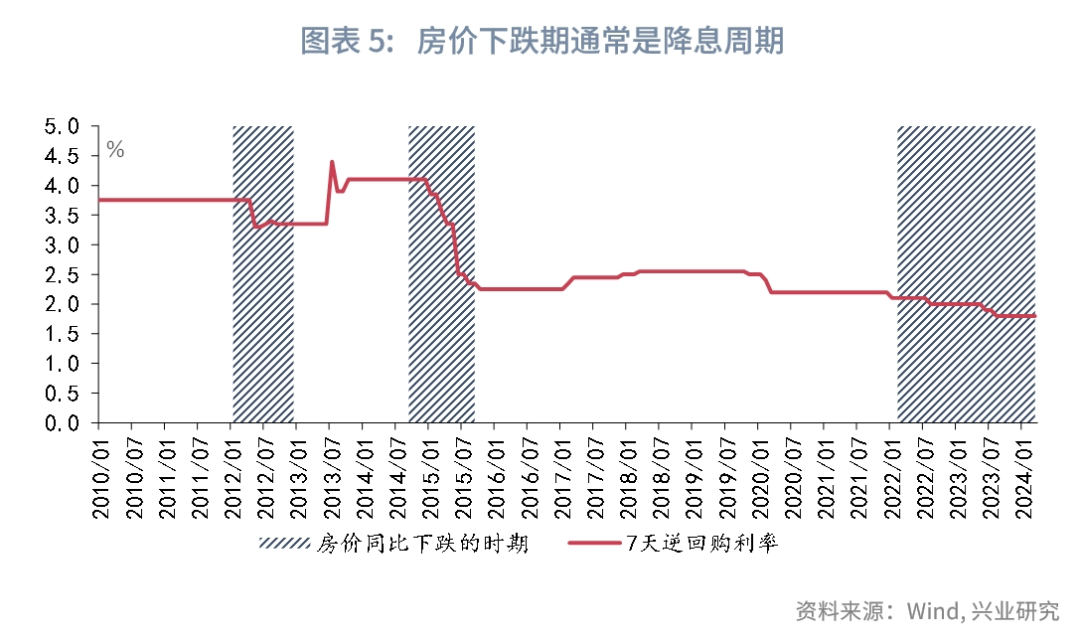 三是从住宅价格来看,当前居民预期房价上涨的比例处于历史较低水平。人民银行调查问卷显示,2023年第四季度,预期未来房价上涨的储户比例仅为12.3%,创下自2010年6月有数据以来的新低。为了稳定住宅价格预期,需要进一步降低房贷利率。历史数据显示,房价同比下跌时期通常也是降息周期。