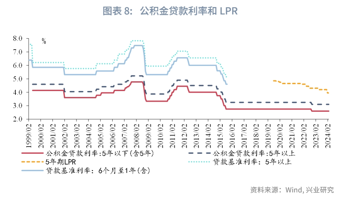 二是降低公积金贷款利率。2022年10月,央行曾将公积金贷款利率下调15bp,5年期以下(含5年)和5年以上公积金贷款利率分别下调至2.60%和3.10%。2022年10月,5年期LPR的水平为4.30%;2024年2月,5年期LPR下调至3.95%,相较于2022年10月已经累计下调35bp。在房贷利率可以下浮的地区,购房商贷利率正在逐渐接近公积金贷款利率,公积金贷款利率有“补降”的诉求。近期,部分城市调整了公积金贷款年限的相关规定,例如,根据上海证券报4月17日的报道[1],北京市拟提高满足条件的公积金贷款的额度,延长已改造老旧小区的公积金贷款年限。为了降低居民部门的融资成本,后续央行可能适当调降公积金贷款利率。