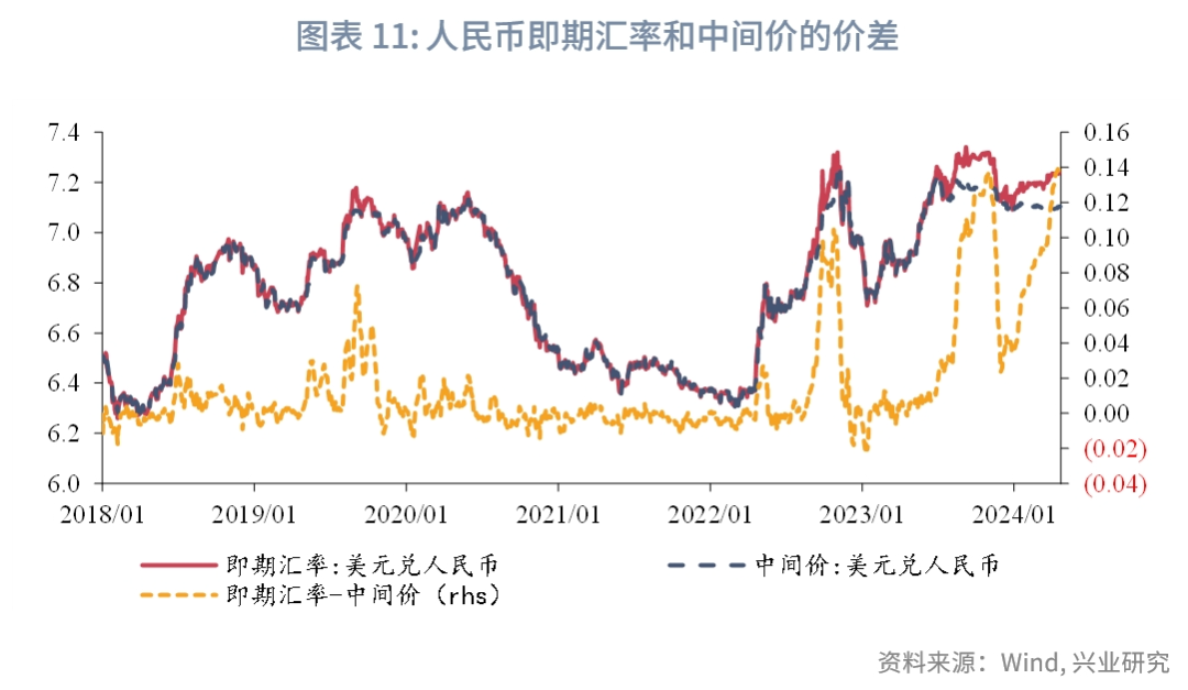 四是进一步提升人民币汇率弹性。人民银行曾在3月6日的新闻发布会[4]上指出,“今年主要经济体货币政策有望转向……国内外的货币政策周期差趋于收敛……这些因素的共同作用,客观上有助于增强我国货币政策的操作空间”。从当前的美联储降息预期来看,市场预期的美联储降息时间进一步推迟到9月,甚至存在美联储年内不降息的可能。2024年开年以来,人民币兑美元即期汇率和中间价之间的价差再度走阔。考虑到政策利率和存款准备金率下调的空间较为宝贵,未来,政策当局或进一步推进人民币汇率市场化改革,提升人民币汇率弹性。