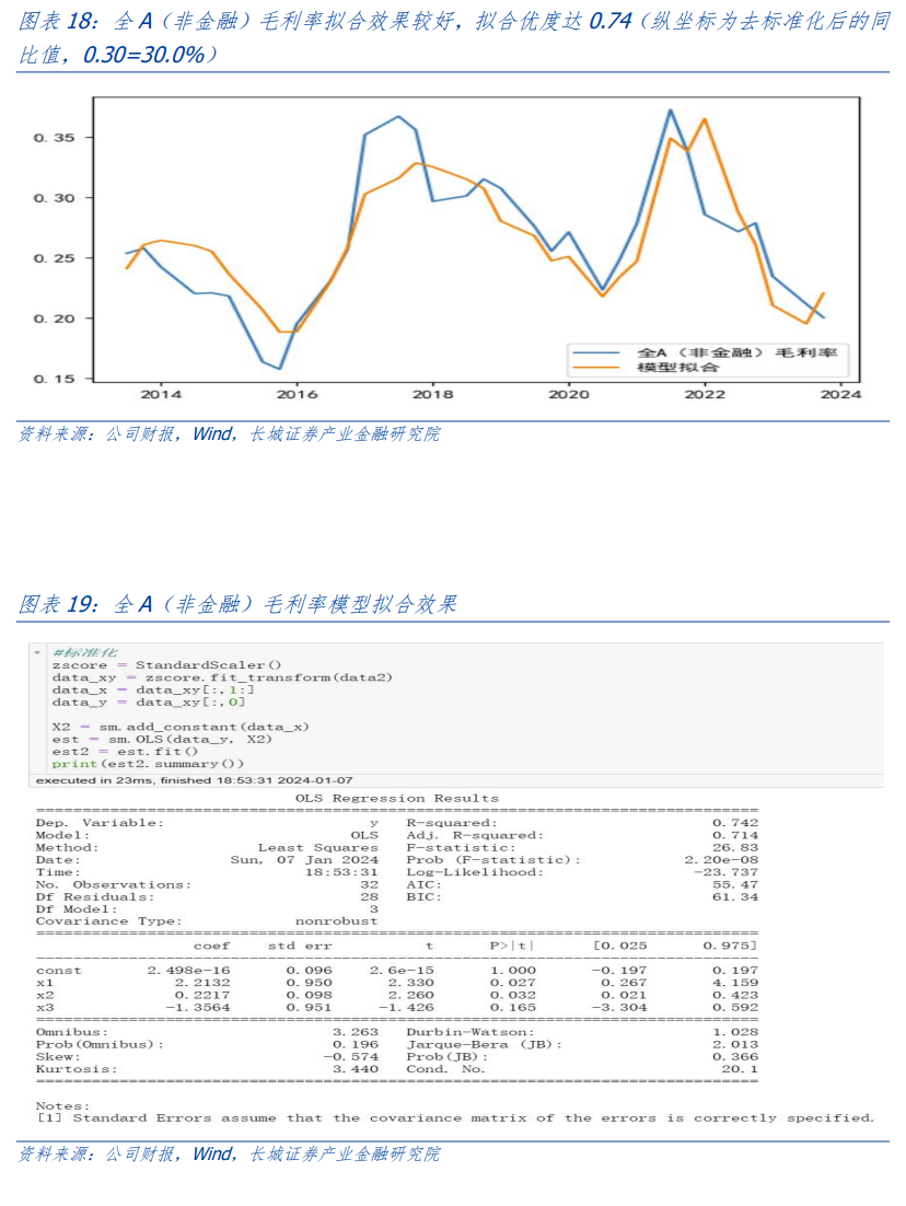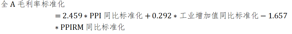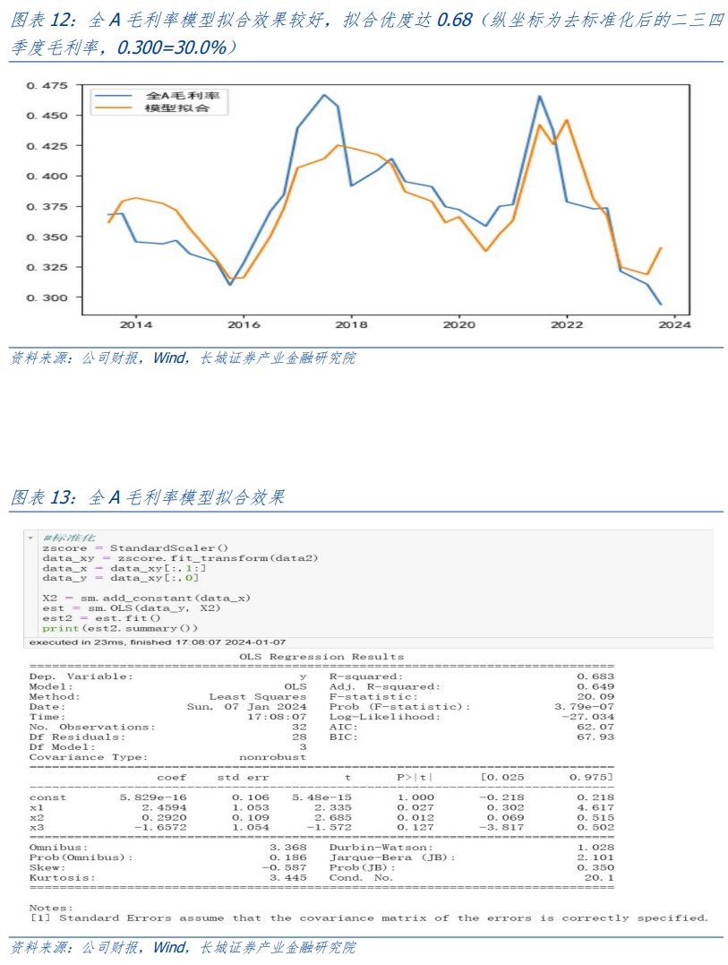 对毛利率进行预测,首先需要面临的问题是毛利率存在季节性干扰,干扰主要集中在一季度,由于春节停产,企业一季度毛利率较其他三个季度大幅下滑,然而宏观经济指标在取同比值下季节影响被剔除,为排除一季度影响,我们只选取二三四季度毛利率数据进行模拟。用PPI、工业增加值、PPIRM对全A毛利率进行模拟(数据区间剔除一季度,保留二三四季度数据,因变量为标准化后的毛利率,自变量均采用标准化后的季频同比值),回归结果如图12和图13,模型拟合效果较好,拟合优度达0.68。以下为全A毛利率的标准化模型函数,PPI代表的产品出厂价格与企业毛利率呈正比,PPIRM代表的生产成本与企业毛利率呈反比。