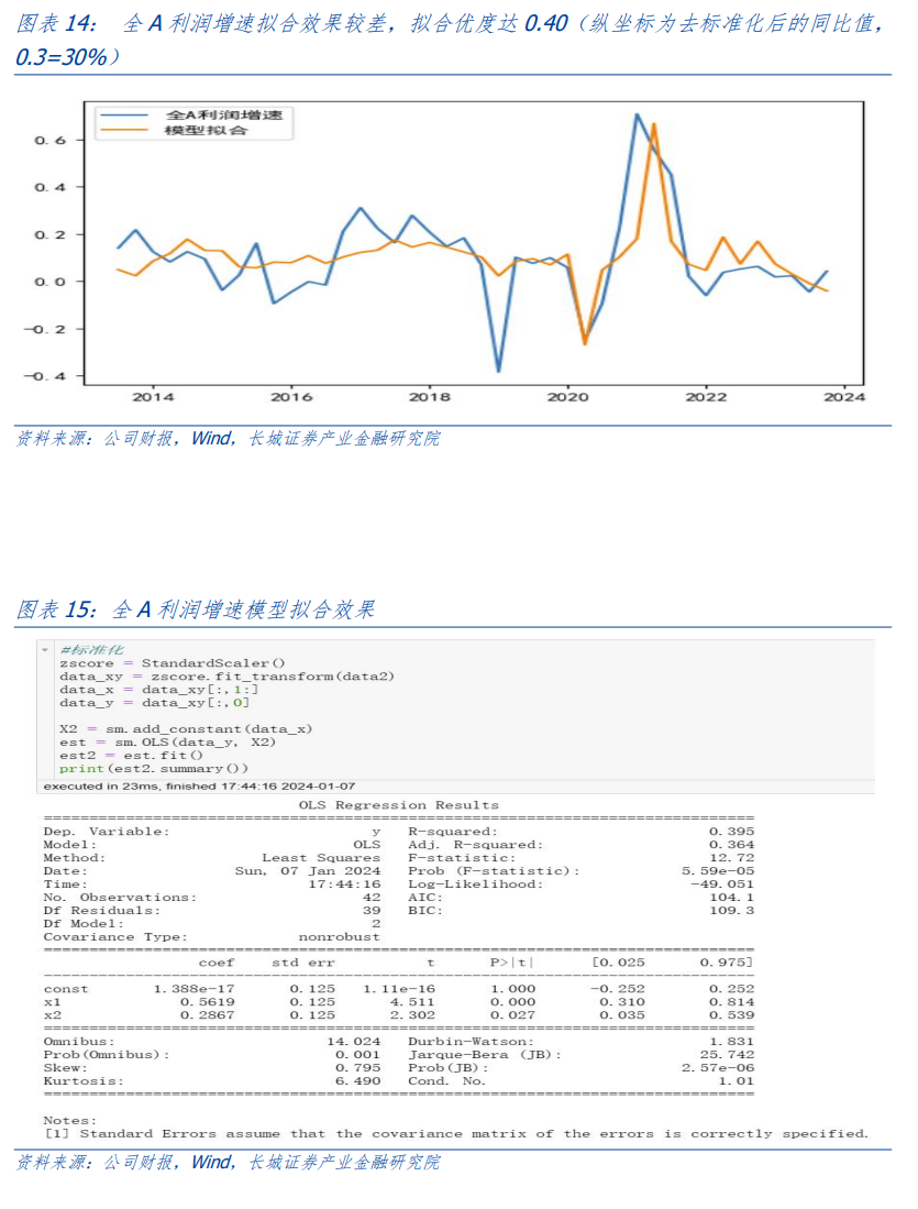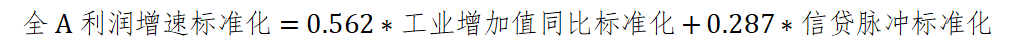 用工业增加值、信贷脉冲对全A利润进行模拟(均采用标准化后的季频同比值进行回归分析),回归结果如图14和图15,模型拟合效果一般,拟合优度仅为0.40。以下为全A利润增速的标准化模型函数,工业增加值及信贷脉冲与全A利润呈正相关,相较下,利润增速对工业增加值的变化较信贷脉冲更为敏感。