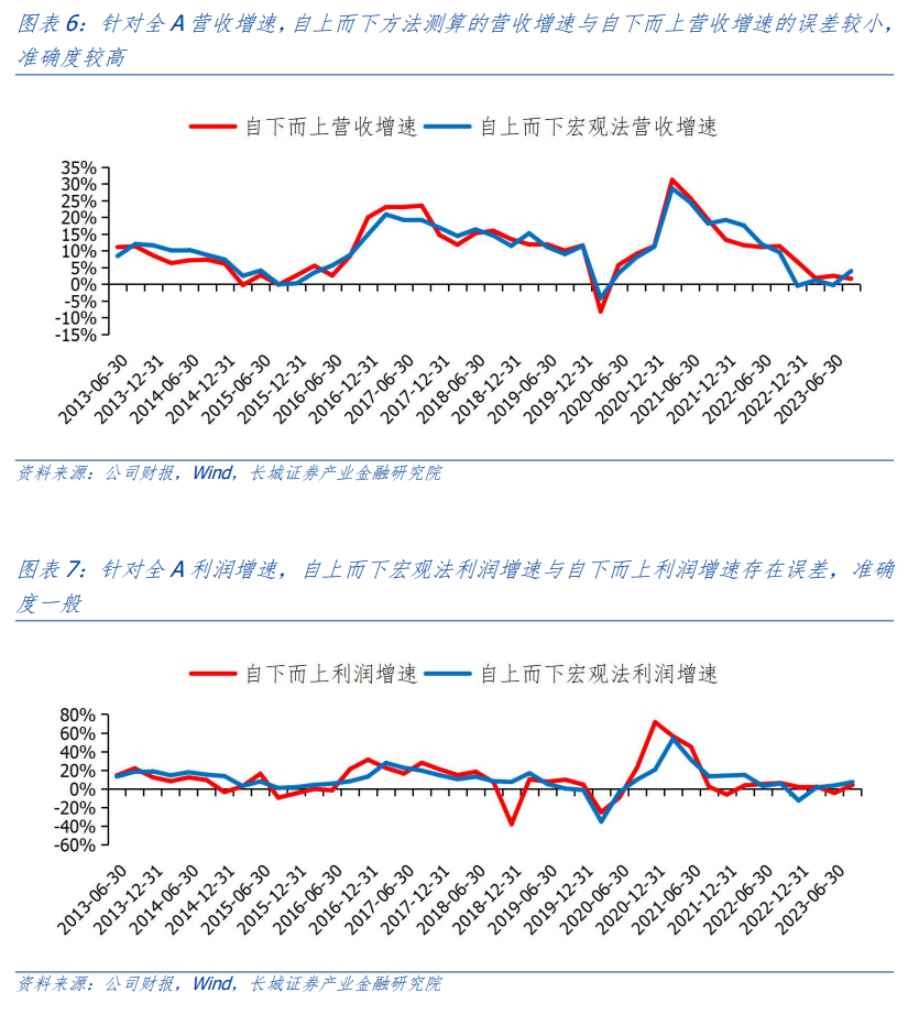 本质上,自上而下宏观法有效地平衡数据准确性和时效性之间的相对关系,充分发挥盈利信息的价值。仔细对比两种方法,自下而上的财务方法拥有绝对的准确性和较低的时效性,自上而下的方法通过交换部分数据准确性,大幅提高时效性;针对全A营收增速,自上而下宏观法测算的营收增速与自下而上方法的实际营收增速误差较小,准确度较高,见图6;针对全A利润增速,自上而下宏观法测算的利润增速与自下而上方法的实际利润增速存在小幅误差,准确度一般,但从趋势角度二者存在一致性,见图7。
