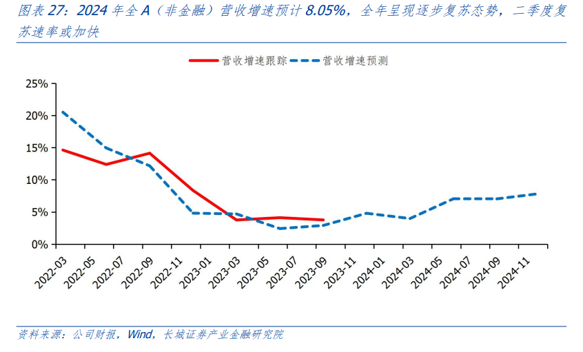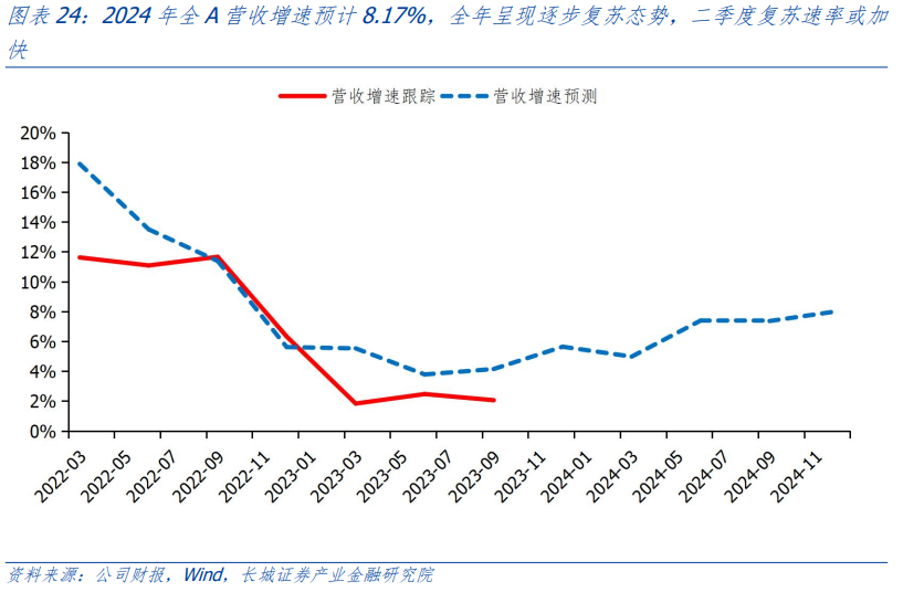 2024年全A营收增速预计8.17%,向上脱离2023年中枢水平,形成需求“预期拐点”,全年呈现逐步复苏态势,或于二季度复苏速率加快。一季度营收增速预计4.98%,二季度营收增速提升2.42pct至7.40%,三四季度仍逐步复苏但节奏放缓,见图24。