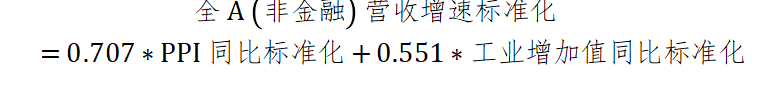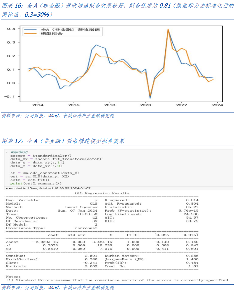 用PPI和工业增加值对全A (非金融) 营业收入进行模拟(均采用标准化的季频同比值进行回归分析),回归结果如图16和图17,模型拟合效果较好,拟合优度达0.81。以下为全A (非金融) 营收增速的标准化模型函数,在剔除银行、证券公司、保险企业后,营收增速模型的拟合效果小幅提高。