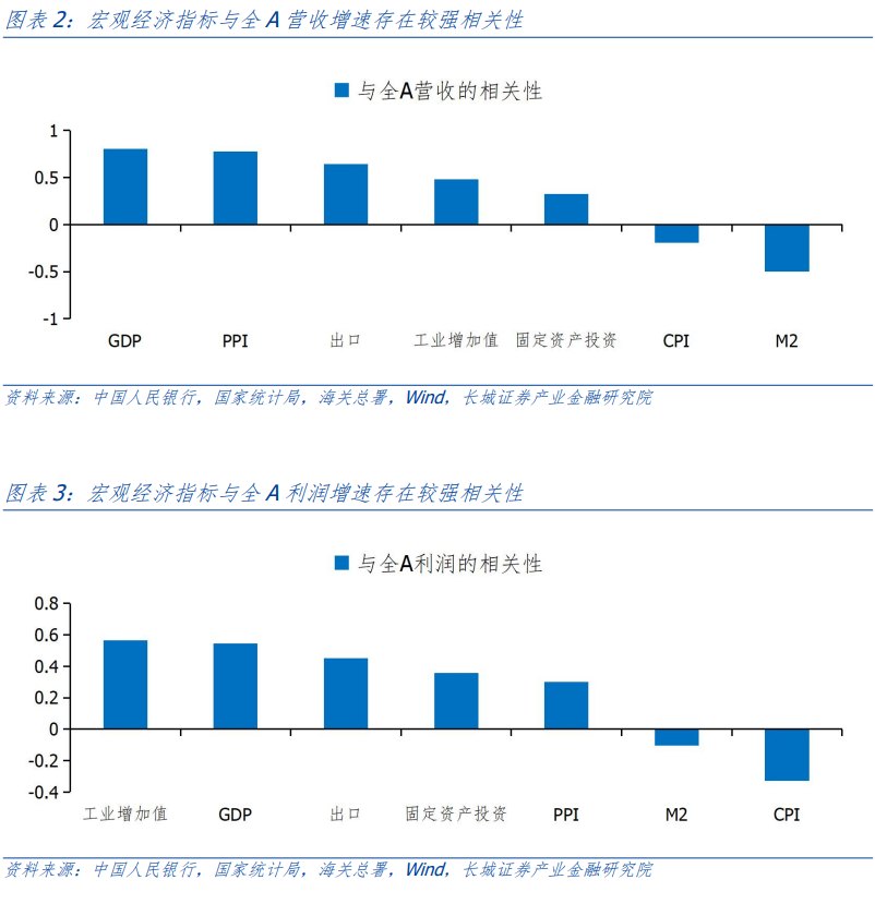 对于全A盈利预测,我们采用自上而下的研究方法,利用宏观分析师对经济指标的一致预期,进行盈利预测。自上而下的宏观法是建立在宏观经济指标与企业整体盈利相关联的前提下,该方法和前提假设存在充分的理论依据,并且存在统计学上的强相关性。