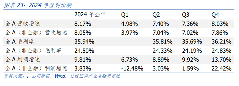 利用宏观分析师的一致预期,我们构建了2024年盈利预测,预计营收增速、毛利率、利润增速整体呈现逐步复苏态势(见下表)。2024年全A年度营收增速预计8.17%,全A毛利率预计35.94%,全A利润增速预计9.81%,2024年全A(非金融)营收增速预计8.05%,全A(非金融)毛利率预计24.50%,全A(非金融)利润增速预计3.83%。整体看,企业利润增速恢复程度预计将好于营收增速,金融性企业的利润修复节奏或早于非金融性企业。