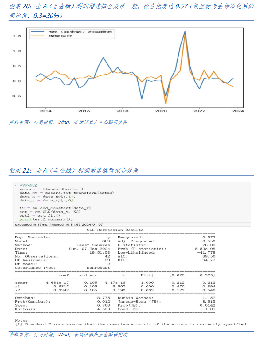 用工业增加值、信贷脉冲对全A (非金融) 利润进行模拟(均采用标准化后的季频同比值进行回归分析),回归结果如图20和图21,模型拟合效果较全A大幅改善,拟合优度达0.57。以下为全A (非金融) 利润增速的标准化模型函数: