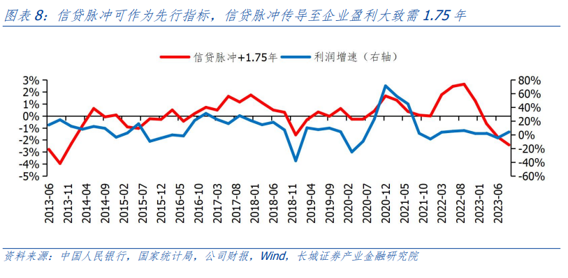 总结以上理论,企业盈利增速存在均值回归特性,是一个长期围绕着某一个中枢进行上下波动的时间序列函数。海外研究机构往往会运用柯布—道格拉斯(Cobb-Douglas)生产函数判断GDP增速的长期中枢,长期中枢由人口增速、资本投入、全要素生产率等宏观因素共同决定;波动的产生源于信贷脉冲,从企业微观层面看,企业融资购买设备扩产或开拓新业务,投资慢慢转为产能拉动盈利提升,企业的融资行为加总与宏观的社融息息相关;信贷脉冲传导至盈利需要一定的时间,根据我们的测算,信贷脉冲传导至企业盈利大致需1.75年,见图8。