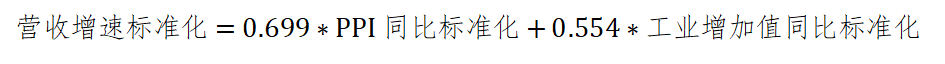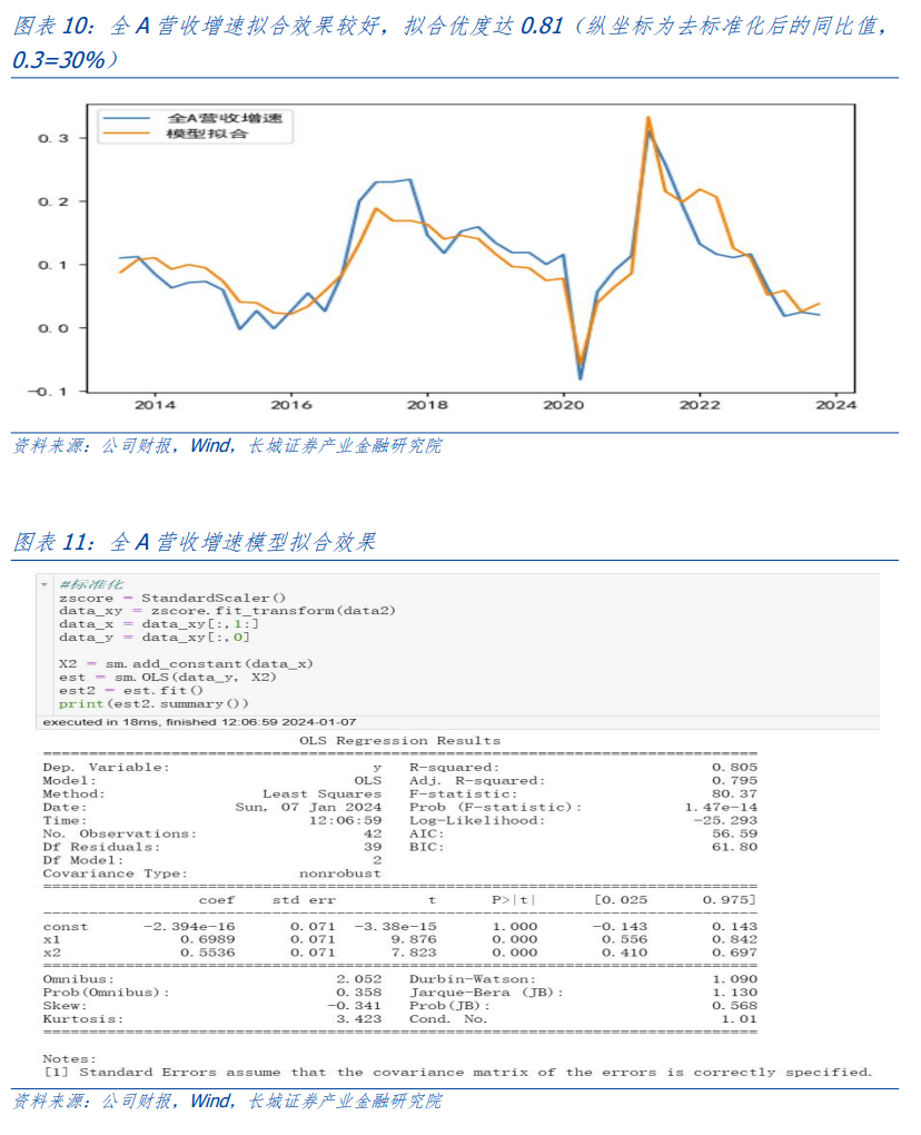 用工业增加值和PPI对全A营业收入进行模拟(均采用标准化后的季频同比值进行回归分析)。回归结果如图10和图11,模型拟合效果较好,拟合优度达0.81。以下为全A营收增速的标准化模型函数,代表标准化下营收增速与PPI同比及工业增加值同比之间的逻辑关系,二者均与营收增速呈正相关,相较下,营业收入对PPI代表的产品出厂价格较工业增加值更为敏感。