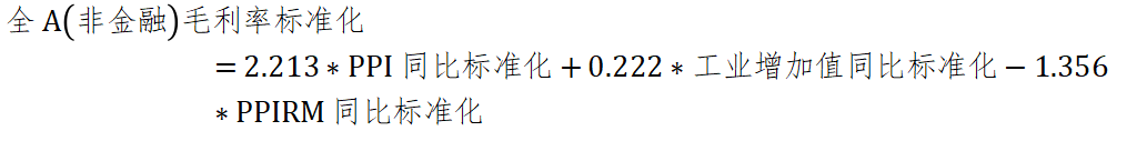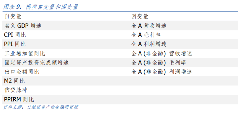 在自上而下全A盈利预测研究体系下,盈利预测的核心是建立宏观经济指标与企业盈利之间的逻辑关系。为此,我们采用多元线性回归的思路,以宏观经济指标为自变量,以全A盈利数据为因变量,构建自上而下全A盈利模型。