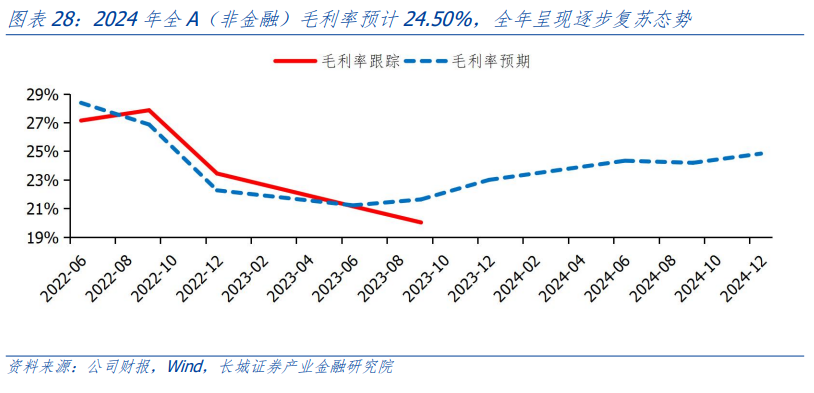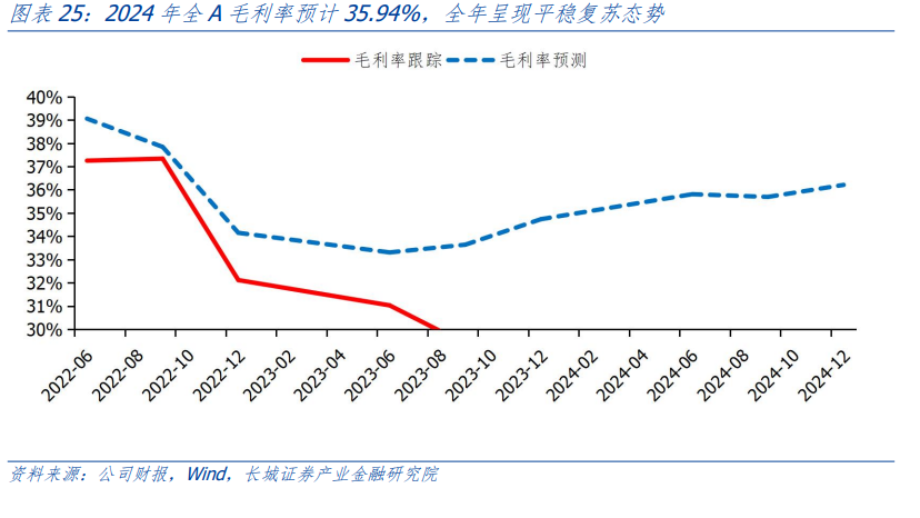 2024年全A毛利率预计35.94%,好于2023年平均水平,全年呈现逐步复苏态势;2024年二季度,全A毛利率预计35.81%,三季度小幅下滑,随后四季度持续复苏,见图25。