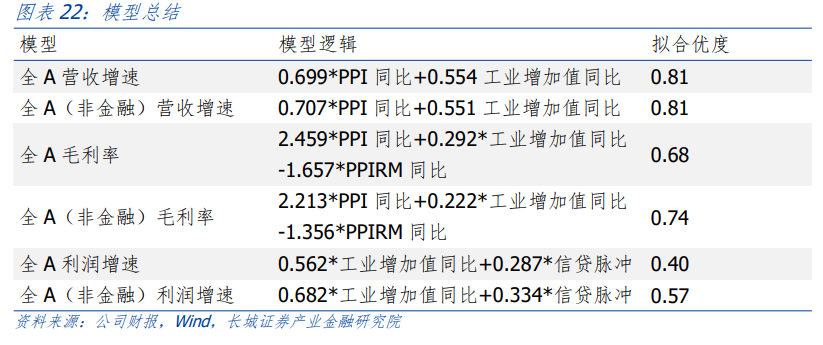 总结以上六种模型(见下表),营收增速模型主要以PPI同比和工业增加值同比为宏观经济指标构建,拟合效果较好,体现我国企业主要以工业和制造业公司为主,企业整体业绩受产品出厂价格影响,产品出厂价格越高,企业业绩将大幅提升。毛利率模型主要以PPI同比、PPIRM同比、工业增加值同比为宏观经济指标构建,体现产品价格及原材料价格对企业毛利率的影响。利润模型主要以工业增加值同比和信贷脉冲为宏观经济指标构建,在剔除金融板块后,全A利润增速模型的拟合效果大幅提升;模型展示企业整体盈利与工业增加值和信贷脉冲之间存在较强的逻辑关系,工业增加值和信贷脉冲都与固定资产投资完成额相关度较高,每当企业整体利润大幅提升,企业往往将部分未分配利润和企业融资所得资金转为投资,以购买新设备、新建产能等形式支出,提高企业生产能力,因此,利润增速与工业增加值、信贷脉冲存在一定的因果关系。