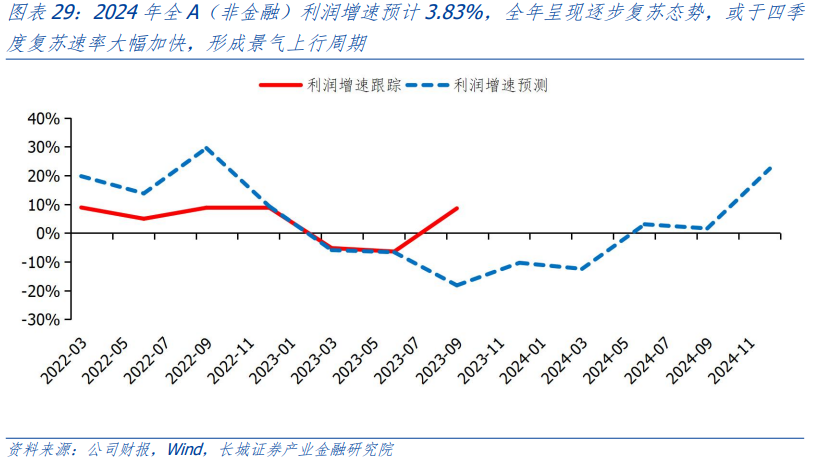 2024年全A(非金融)利润增速预计3.83%,基本脱离2023年的负增长区间,全年呈现逐步复苏态势,或于四季度复苏速率大幅加快,形成景气上行周期;2024年一季度全A(非金融)利润增速仍为负增长,三季度后,四季度利润增速大幅提升20.83pct至20.42%,见图29。