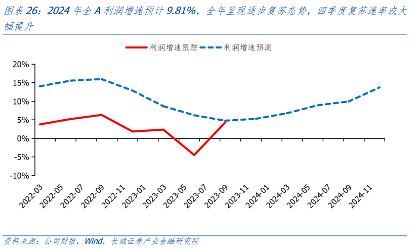 2024年全A利润增速预计9.81%,向上脱离2023年中枢水平,全年呈现逐步复苏态势,或于四季度复苏速率大幅加快,形成景气上行周期;三季度利润增速预计9.92%,二季度利润增速提升3.78pct至13.70%,见图26。