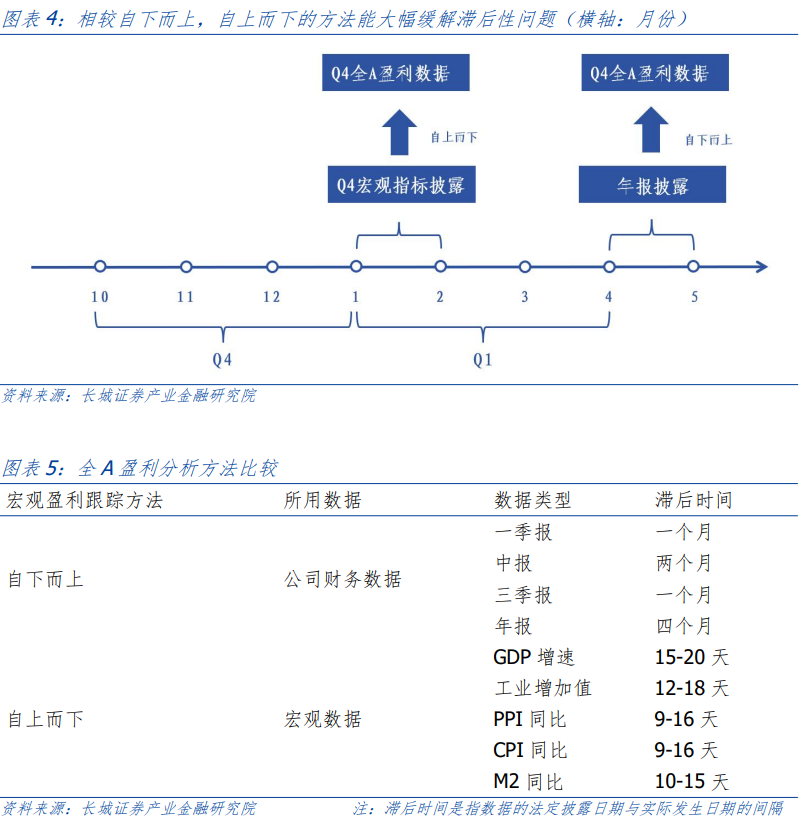 针对已发生但未披露财报的季度,我们的全A盈利预测采用自上而下的研究方法,利用已披露的宏观指标,以之为自变量,通过宏观指标与盈利数据之间的逻辑关系,可估算盈利数据。对比盈利跟踪所用到的自下而上方法,自上而下的宏观法通过采用宏观数据大幅缓解滞后性,见图4;两种方法本质区别在于使用的数据不同,财报数据披露平均滞后2个月,而宏观指标披露时间微微滞后15-20天。盈利数据时效性的提高,自然能提升盈利信息的价值,对宏观研究和投资起到更为重要、及时的作用。