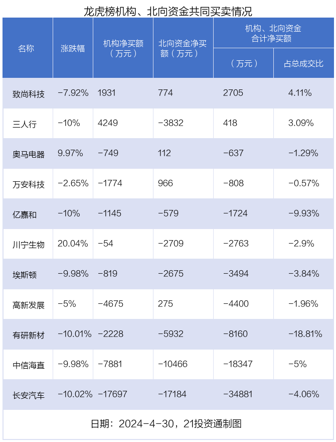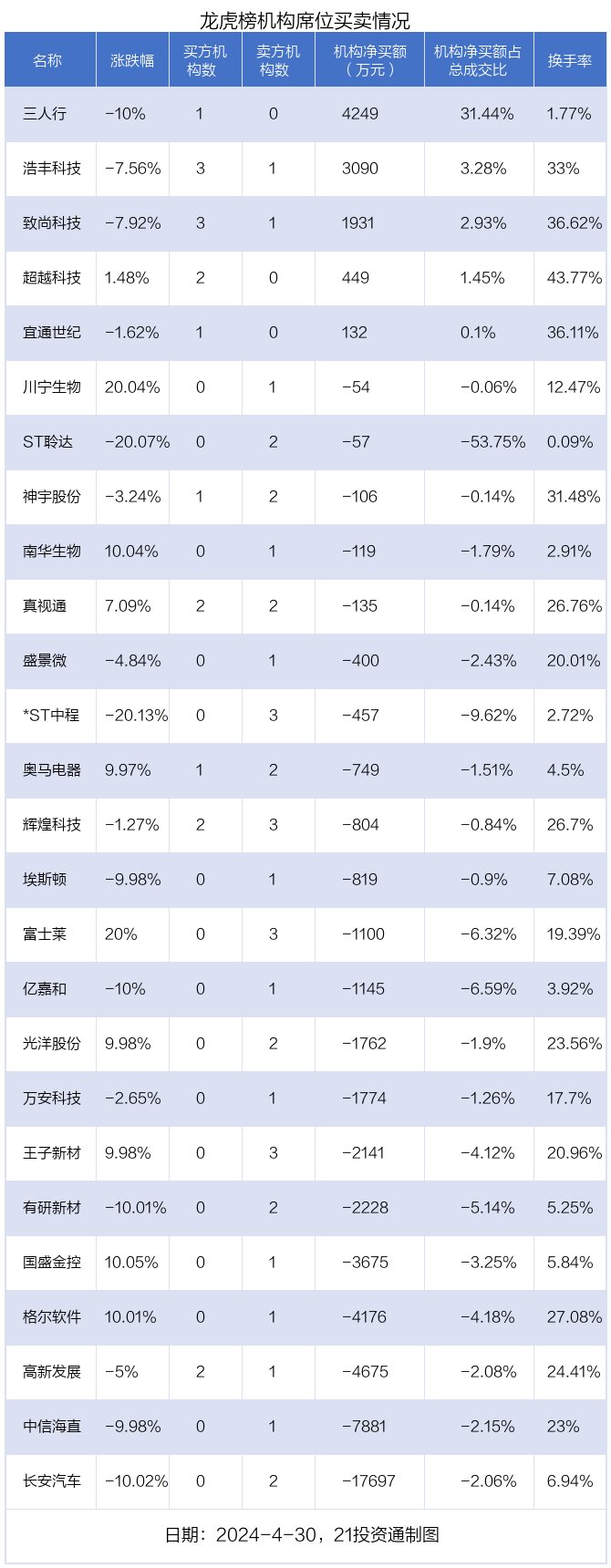 4月30日,26只个股龙虎榜出现了机构的身影,机构合计净卖出4.21亿元。具体来看,机构净买入5股,净卖出21股。