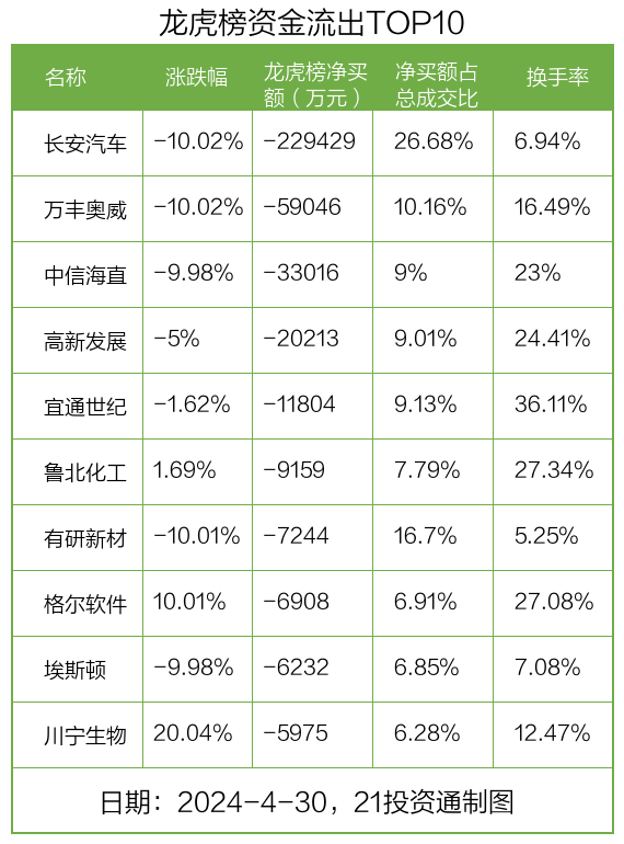 而龙虎榜中资金净流出最多的是长安汽车(000625.SZ),被净卖出为22.94亿元,占总成交金额的26.68%。长安汽车收盘下跌10.02%,换手率为6.94%。