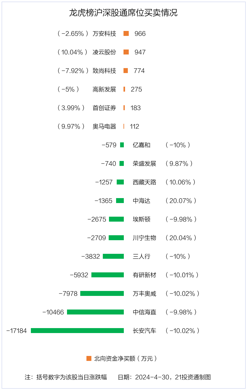4月30日,北向资金参与龙虎榜中的个股共有17只,合计净卖出5.15亿元。其中沪股通净买入2 股,净卖出4 股,合计净卖出1.05亿元;深股通净买入4 股,净卖出7 股,合计净卖出4.1亿元。