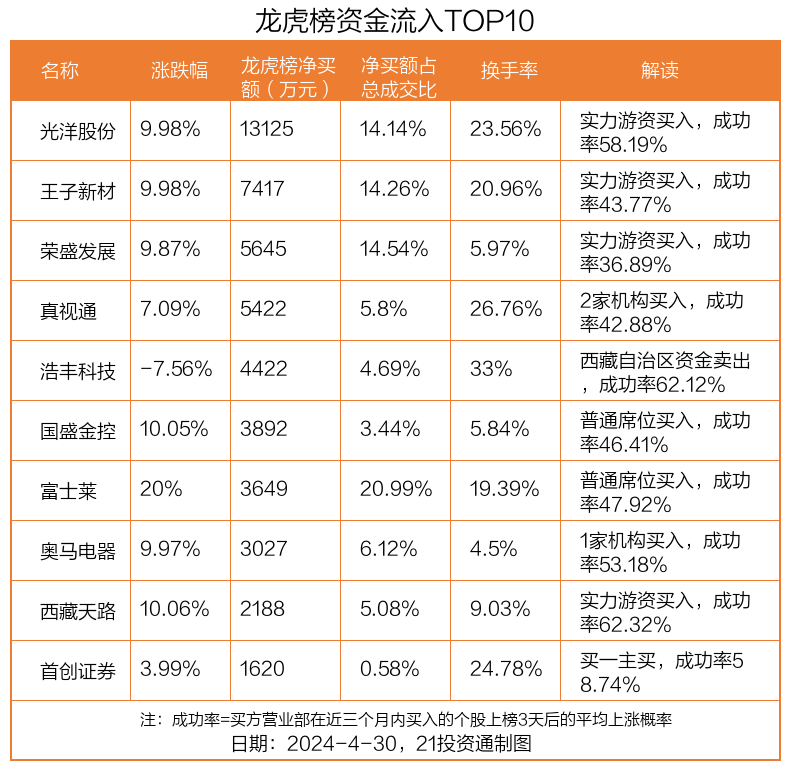 4月30日,上证指数下跌0.26%,深证成指下跌0.9%,创业板指下跌1.55%。盘后龙虎榜数据显示,共有59只个股因当日异动登上龙虎榜,资金净流入最多的是光洋股份(002708.SZ),达1.31亿元。