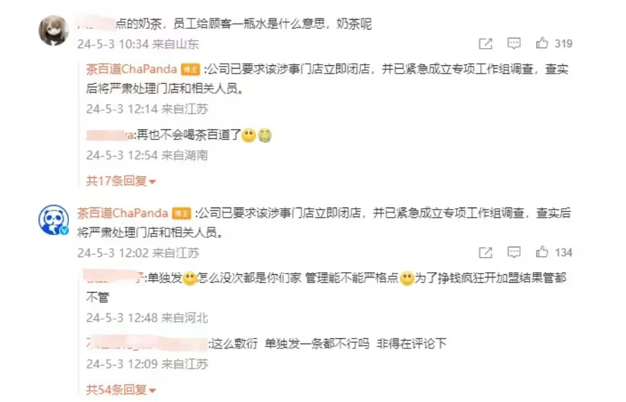 5月3日下午,@茶百道ChaPanda 针对白开水事件发布声明。茶百道在声明中表示,目前,茶百道已要求门店开除涉事员工,并按照公司门店管理制度扣除门店保证金,依法依规与其闭店解约。同时,茶百道也决定谨以“胖猫”之名,向四川省青少年发展基金会“茶百道爱心基金”追加捐款100万元,用于关爱青少年类公益项目。